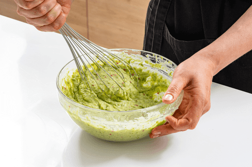 В другую миску разбить яйцо, добавить муку с разрыхлителем и смешать с гороховым пюре.