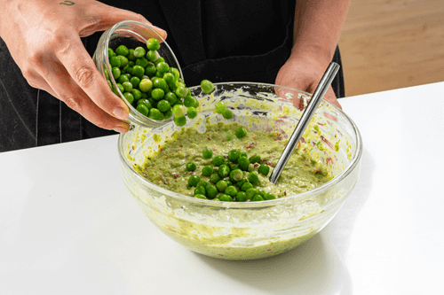 Добавить оставшийся целым горошек и аккуратно перемешать, чтобы горошины сохранили форму.