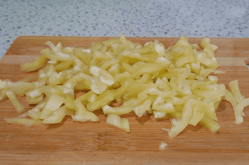 Сладкий перец нарезать соломкой и выложить в миску к помидорам.