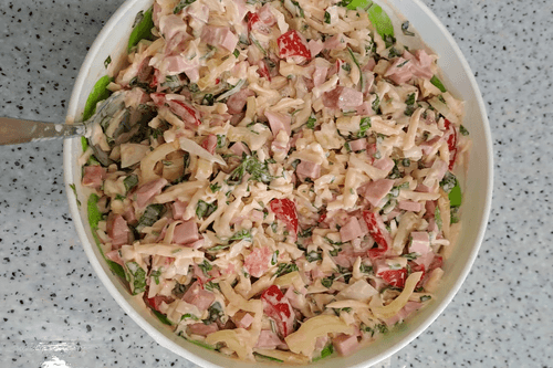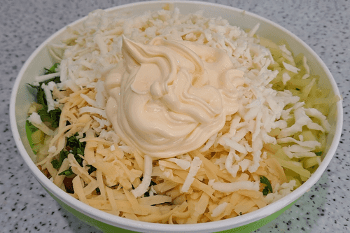 Твердый сыр натереть на крупной терке и добавить к подготовленным ингредиентам.