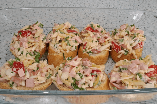 На каждый кусок багета выложить примерно 1,5 столовой ложки смеси и равномерно распределить.