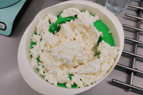 Когда сыворотка стечет в чашу, в сетке останется творожный сыр. Сыворотку слить, она больше не понадобится.