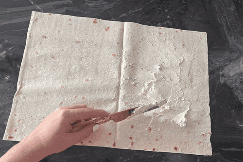 Развернуть лаваш и намазать тонким слоем творожный сыр. Сделать это небольшим ножом, так как ложкой не так удобно.