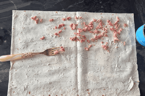 Далее достать из банки тунец, нарезать (покрошить, поломать) на мелкие кусочки и высыпать на лаваш. Следить, чтобы с тунца не вылился сок, иначе лаваш размякнет и будет невкусно.