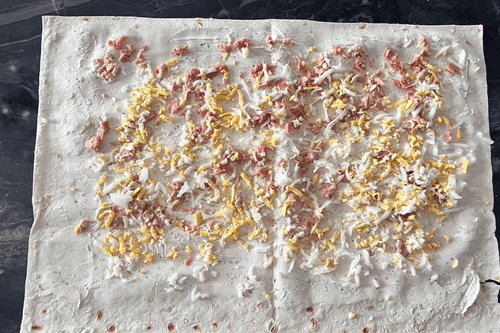 Затем натереть на терке яйца, огурец и сыр. Равномерно распределить на лаваше, немного оставить место с одной стороны, чтобы удобно было завернуть. Разогреть духовку до 130 градусов в режиме обдува сверху.