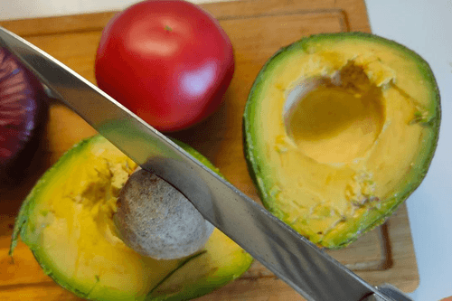 Авокадо разрезать пополам и с помощью ножа вынуть косточку.