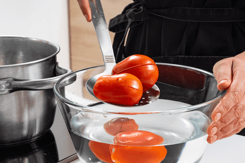 На томатах сделать крестообразные надрезы и отправить в кипяток на 1 минуту. Резко охладить в воде.