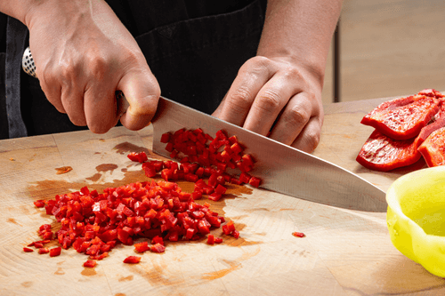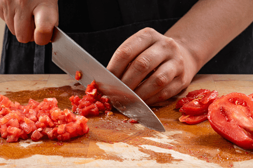 Очистить томаты от кожуры и нарезать мелкими кубиками.