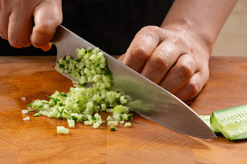 Нарезать огурец. Если кожица жесткая, ее можно очистить.