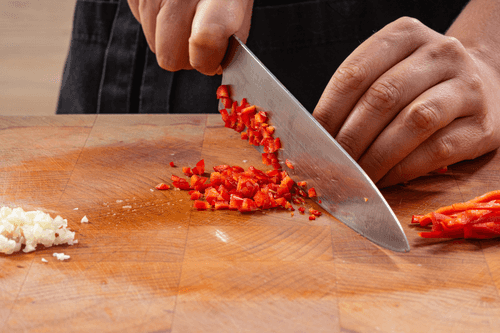 Мелко порубить чеснок и перец чили.