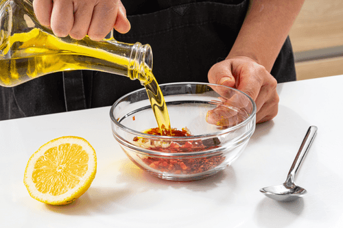 Приготовить заправку. Смешать измельченные чеснок и перец чили, оливковое масло, лимонный сок, хлопья чили, сумах, соль и перец.