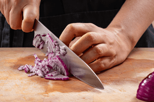 Красный лук нарезать очень мелкими кубиками.