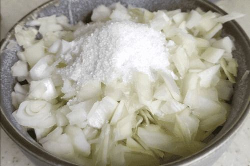 Лук убрать в отдельную миску, слегка сдавить и добавить 1 чайную ложку соли. Оставить на несколько минут.
