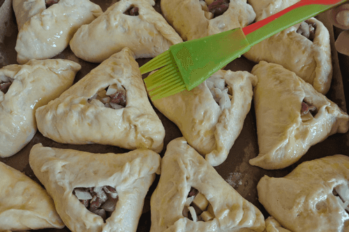 Эчпочмаки выложить на противень и смазать яичной смесью. Выпекать в разогретой до 200 градусов духовке 40 минут до образования румяной корочки.