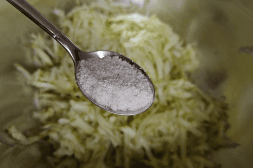 В глубокую миску положить кабачок и посолить.