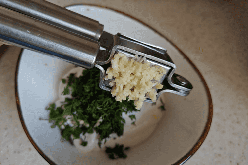 Через пресс пропустить чеснок и перемешать до однородности.