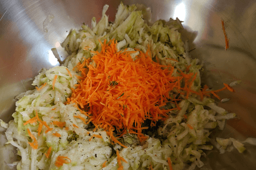 К кабачку добавить морковь и вторую половину укропа. Перемешать.