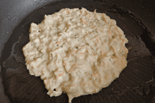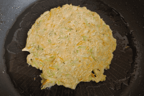 На хорошо разогретую сковороду с подсолнечным маслом выложить кабачковую смесь и сформировать оладушек диаметром 10–15 см.