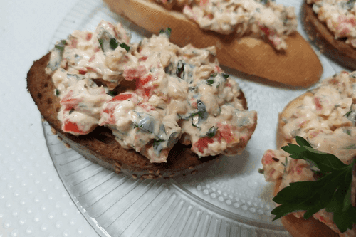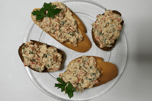 Выложить закуску на обжаренные хрустящие ломтики хлеба.