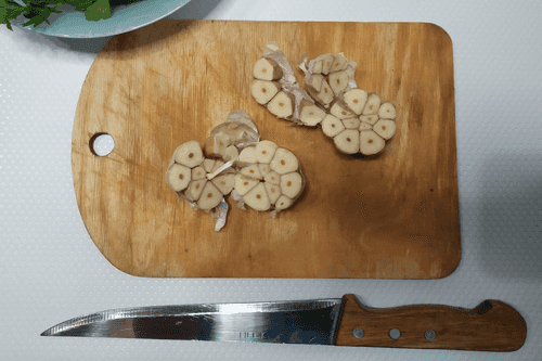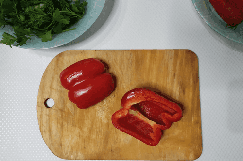 Красный болгарский перец разрезать пополам, удалить ножку и семена.
