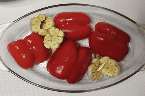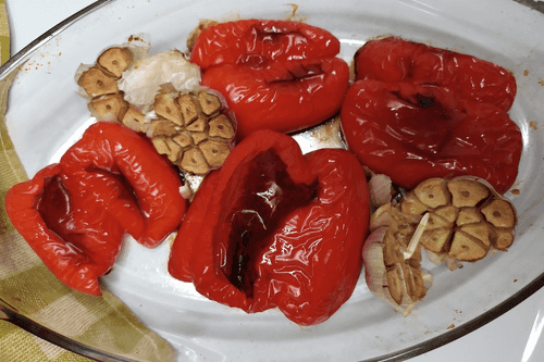 Запечь в духовке при температуре 180 градусов в течение 20–25 минут, до небольших черных подпалин на перце.