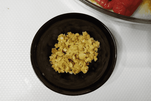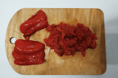 Запеченный перец очистить от кожуры и мелко нарезать.