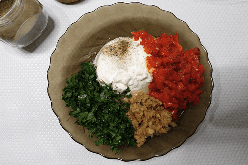 Соединить все ингредиенты в миске с рикоттой, добавить соль и черный молотый перец по вкусу.