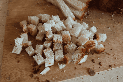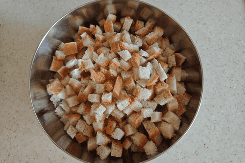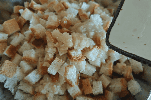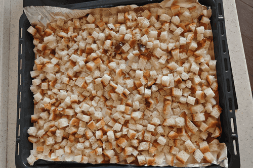 Противень застелить фольгой и равномерно распределить сухарики. Убрать в разогретую до 200 градусов духовку на 7–10 минут.