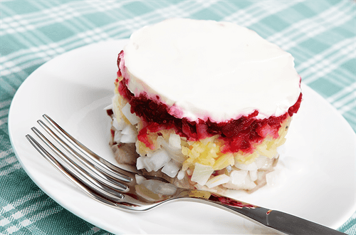 В отличие от традиционной шубы здесь отсутствует картофель, но присутствует яблоко. В результате блюдо получается более легким, ароматным и очень интересным по вкусу.