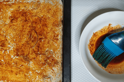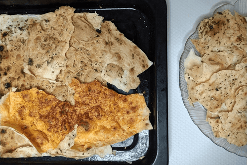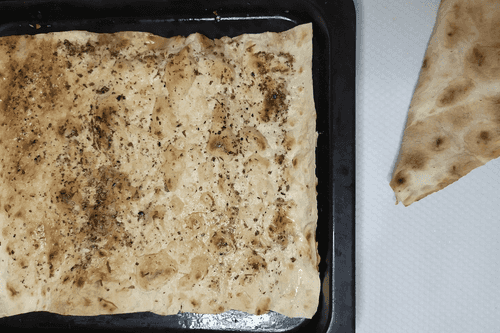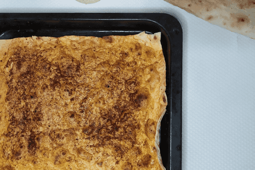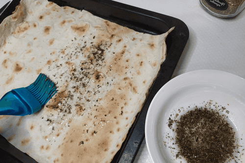 Намазать лаваш кисточкой тонким слоем масла со специями. Отправить в духовку запекаться на 10 минут при температуре 180–200 градусов до подрумянивания и хруста.