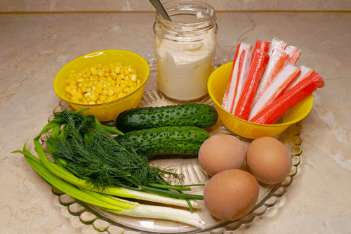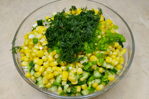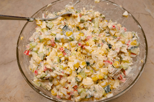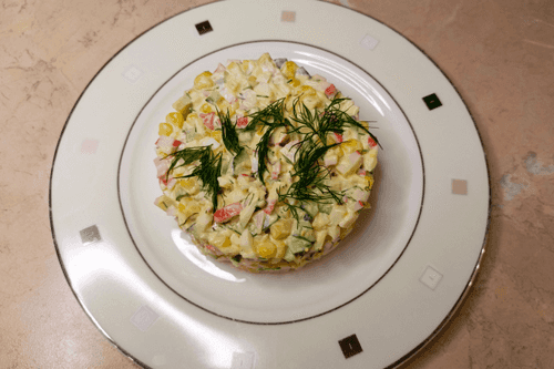 Крабовый салат с кукурузой и свежими огурцами
