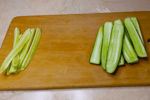 Огурцы разрезать на четвертинки, срезать мякоть.