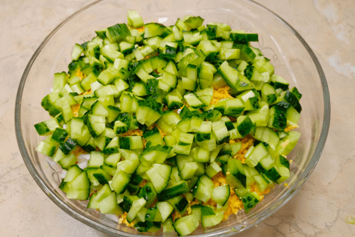 Огурцы нарезать мелкими кубиками. Добавить в салатник.