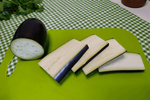 Баклажан промыть, разрезать пополам и затем каждую половину вдоль на слайсы толщиной примерно 0,5 см.