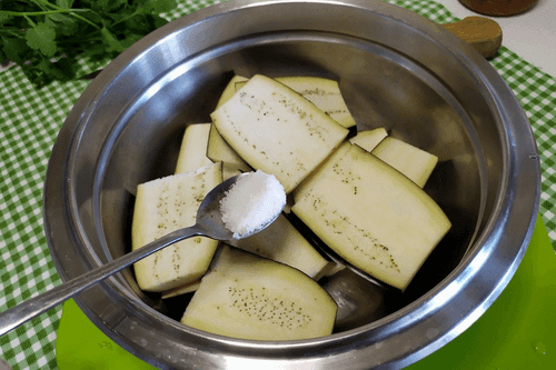 Баклажан посолить, перемешать и дать постоять 5–10 минут.