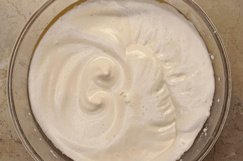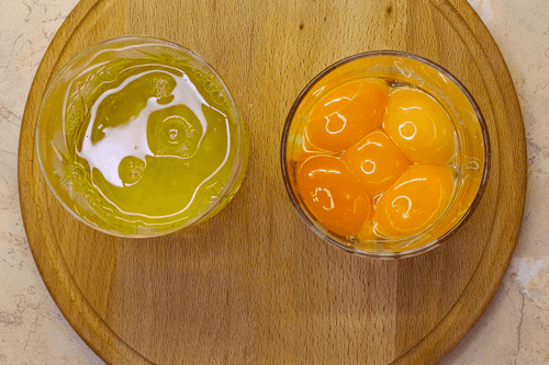 Желтки добавить к белкам, продолжать взбивать миксером.