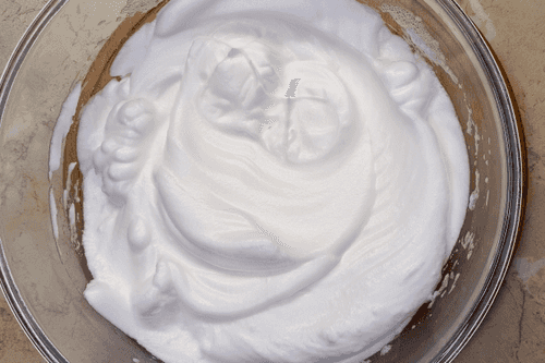 Аккуратно частями смешать взбитые белки и желтки с морковью.