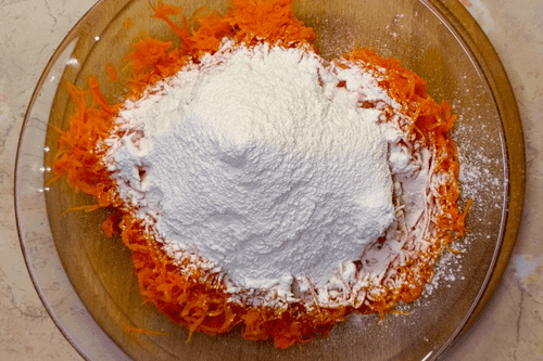 К натертой моркови добавить 3 столовые ложки просеянной муки, все хорошо перемешать.