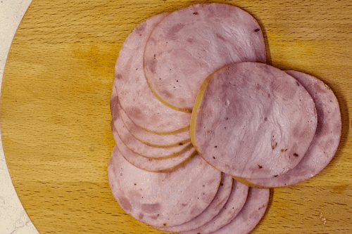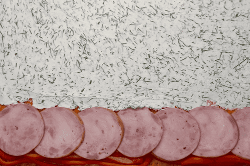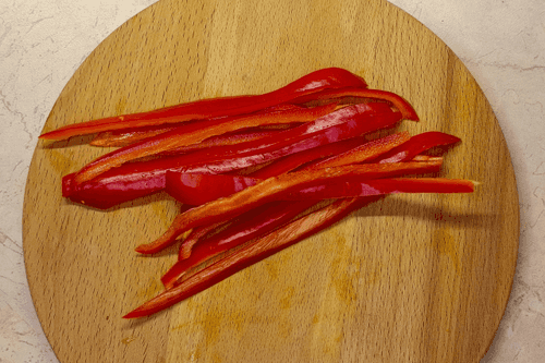 По длинному краю разложить болгарский перец. Рядом выложить ветчину.