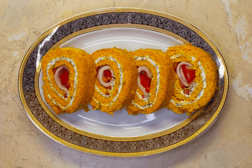 Морковный рулет с ветчиной — это элегантное и яркое блюдо европейской кухни, соединяющее свежесть овощей с нежным сливочным вкусом. Легкий, воздушный бисквит из моркови, приготовленный с добавлением взбитых яиц, создает мягкую основу, которая прекрасно сочетается с пикантной ветчиной, сладким болгарским перцем и ароматным творожным сыром с укропом и чесноком. Этот рулет не только радует глаз своим насыщенным оранжево-зеленым цветом, но и восхищает гармоничным балансом вкусов — сладковатая морковь, солоноватая ветчина и пряная начинка. Его нежная текстура делает его идеальным вариантом для закуски на праздничный стол или легкого ужина. Благодаря охлаждению в холодильнике он приобретает плотность и удобство нарезки, позволяя подать его красивыми порционными кусочками.