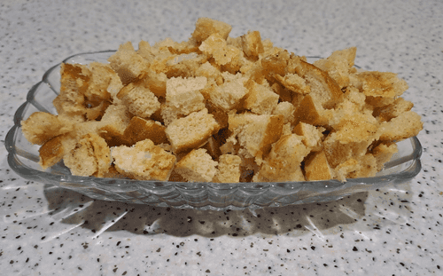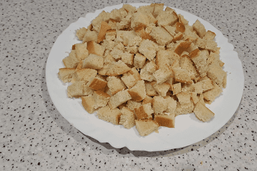 Нарезать батон кубиками небольшого размера. Батон лучше взять вчерашний.