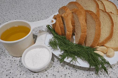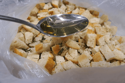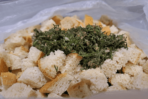 Выложить подготовленные укроп и приправы в пакет с нарезанным кубиками батоном.