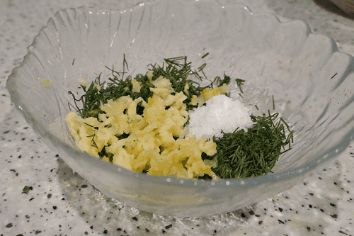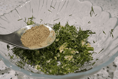 Выложить в емкость с нарезанным укропом прованские травы и молотый черный перец по вкусу.