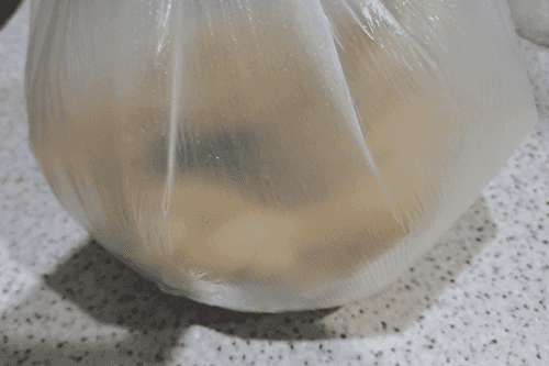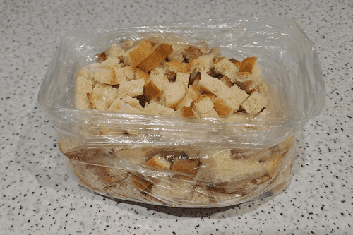Переложить нарезанный кубиками батон в полиэтиленовый пакет.
