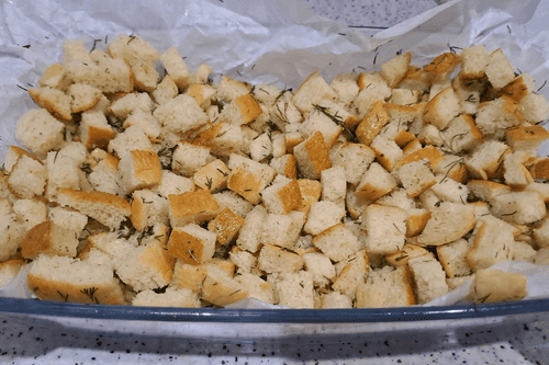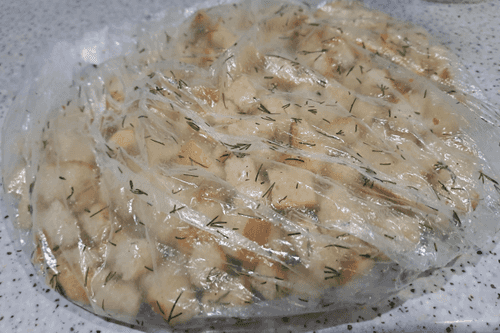 Пакет немного надуть, хорошо закрыть и перемешать батон с приправами и укропом, аккуратно потряхивая.