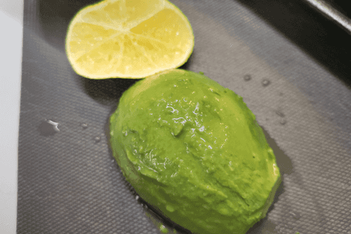 Авокадо очистить, разрезать пополам и сбрызнуть соком лимона.