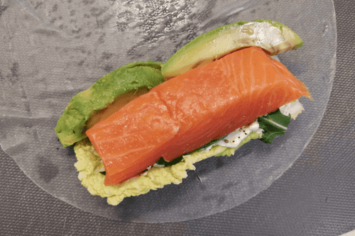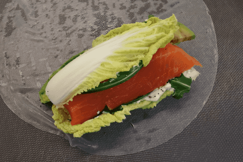 Выложить на край бумаги лист капусты, сверху добавить брусочек рыбы, сбоку авокадо.