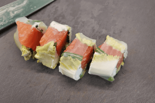 Ножом, смоченным в холодной воде, нарезать ролл на более мелкие.