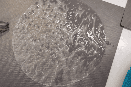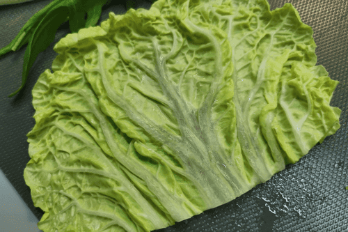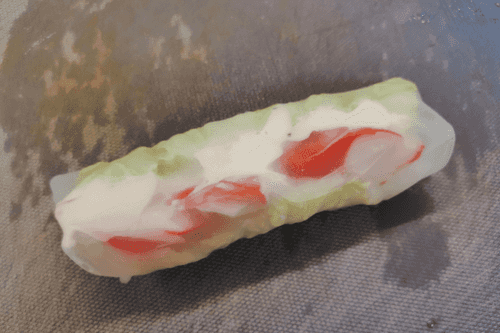 Лист рисовой бумаги замочить в воде на несколько секунд, затем переложить на разделочную доску.