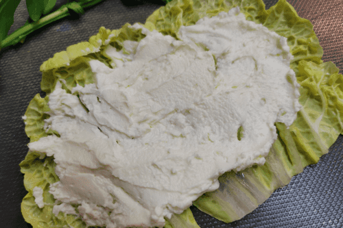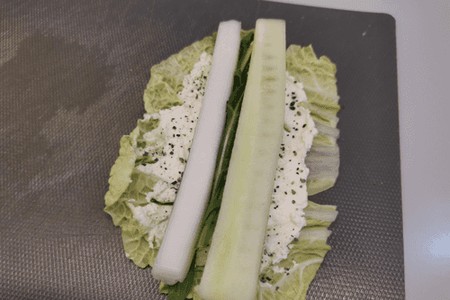Сверху выложить руколу, огурец и белую часть пекинской капусты.